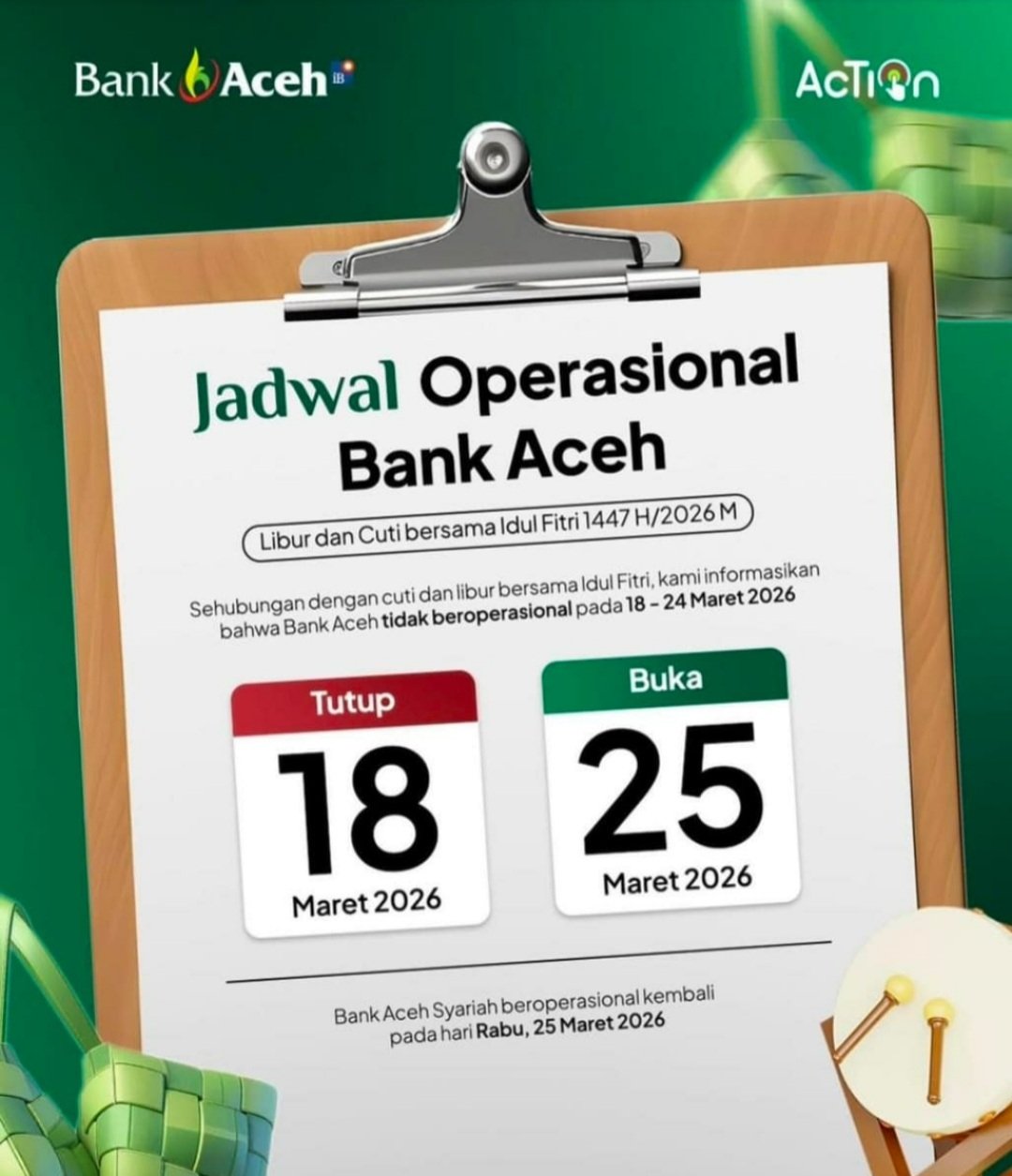 “Nasabah tetap bisa bertransaksi menggunakan Action Mobile Banking dan ATM. Kami juga mengimbau masyarakat agar waspada terhadap berbagai modus penipuan yang mengatasnamakan Bank Aceh,” ujar Andri, Selasa (17/3/2026).