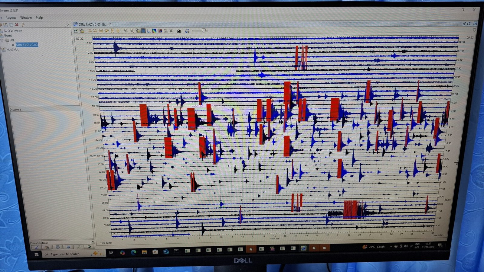 Dari sisi kegempaan, terekam 44 gempa vulkanik dalam dengan amplitudo 10–45 mm, durasi 10–25 detik, serta 15 gempa tektonik lokal dan 17 gempa tektonik jauh dengan amplitudo antara 25–55 mm. Selain itu, tercatat hujan deras pada pukul 16.10–17.35 WIB.