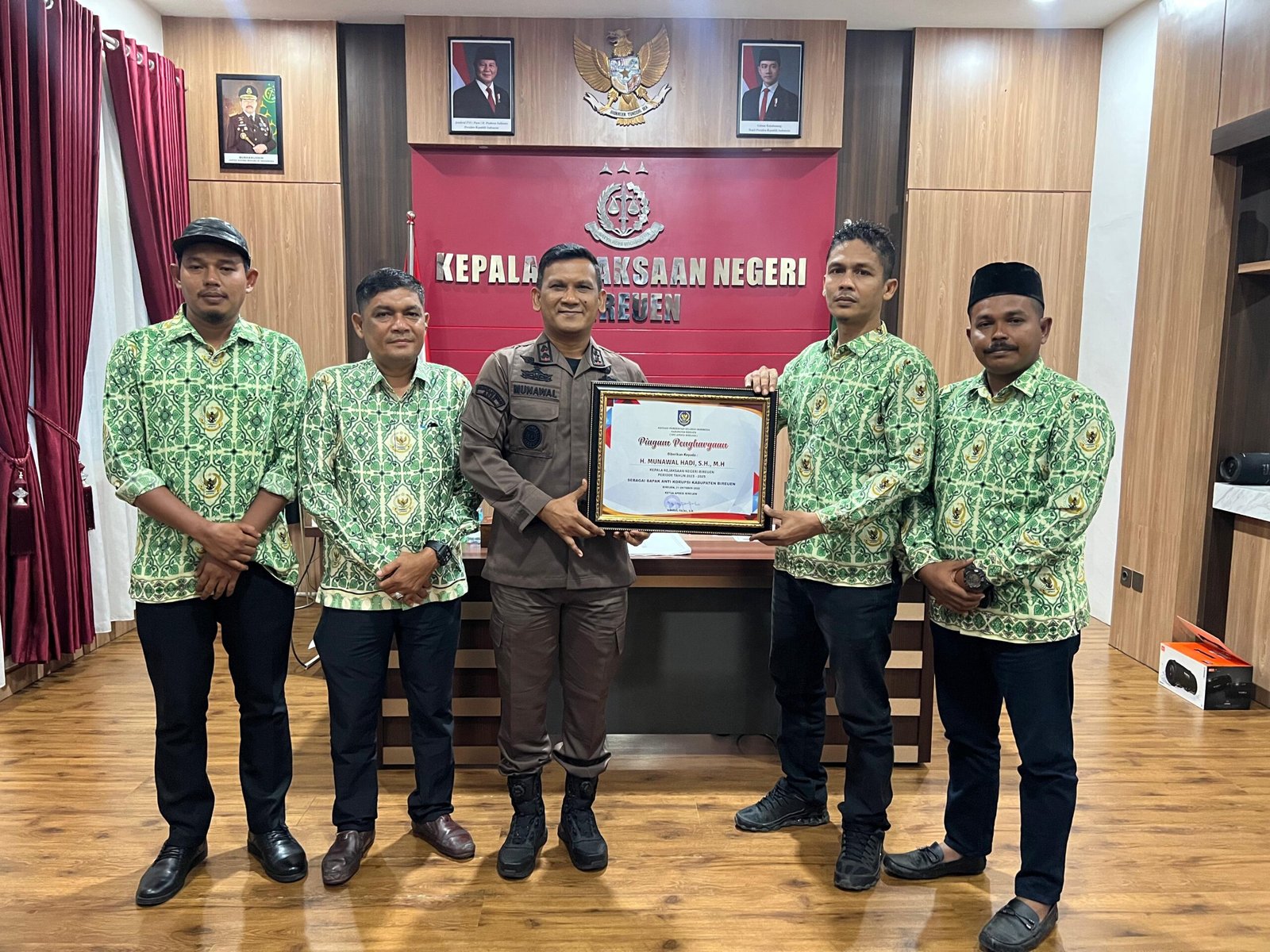 BIREUEN (GAYOExpost.com)-Kepala Kejaksaan Negeri Bireuen Munawal Hadi.S.H.M.H., menerima Piagam penghargaan Sebagai Bapak Anti Korupsi Kabupaten Bireuen dari Asosiasi Pemerintah Seluruh Indonesia Kabupaten Bireuen (DPC APDESI Bireuen), bertempat di Kantor Kejaksaan Negeri Bireuen Kamis 23 Oktober 2025.