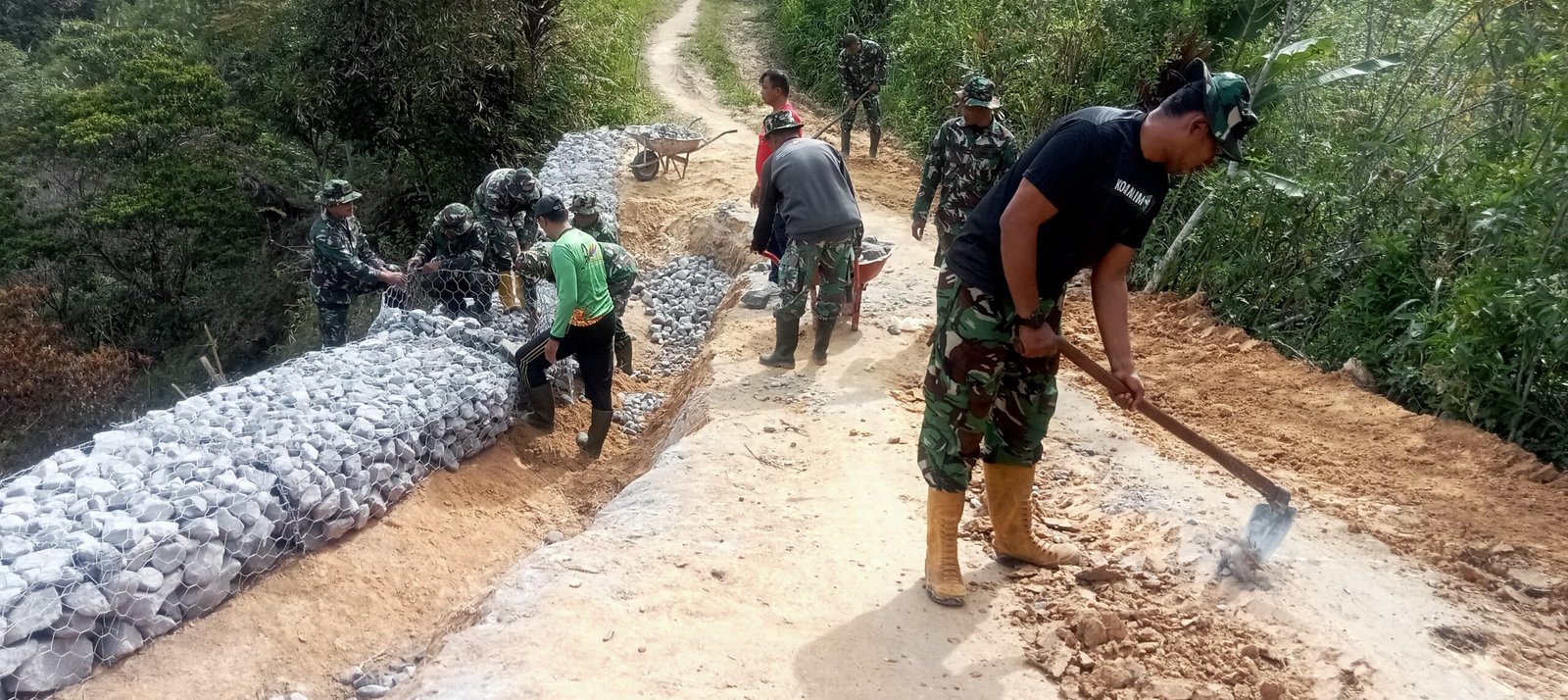 Dengan semangat gotong royong, personel TNI dan warga bahu membahu mengangkut batu, menata kawat bronjong, serta menyusun material secara rapi dan kuat. Meski cuaca cukup terik, semangat kerja sama antara TNI dan masyarakat tetap tinggi.