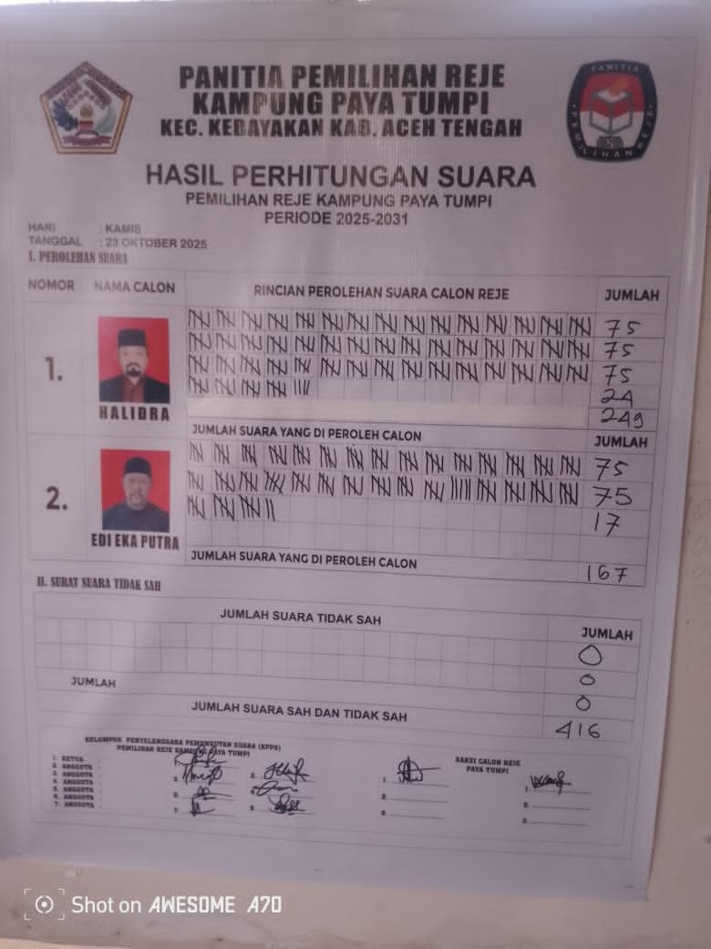 Takengon (GAYOExpost.com) – Halindra mengantongi suara terbanyak sebagai kandidat calon reje (Kepala Desa) Kampung Paya Tumpi, Kecamatan Kebayakan Kabupaten Aceh Tengah.
