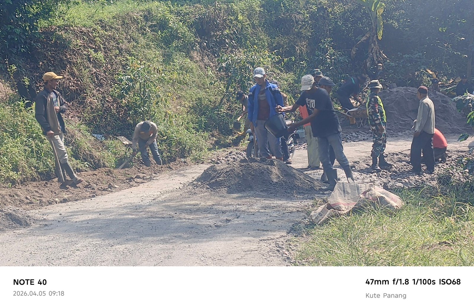Dalam kegiatan gotong royong itu, terlihat pula Babinsa dan Danpos Kute Panang turut hadir membantu warga, menunjukkan kepedulian bersama terhadap kondisi infrastruktur yang selama ini terabaikan.