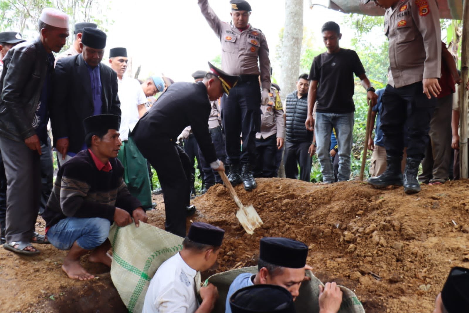 Setibanya di lokasi pemakaman, prosesi dilanjutkan dengan penimbunan liang lahat yang diawali oleh Kapolres Aceh Tengah dan dibantu oleh personel Polres Aceh Tengah, pihak keluarga, serta masyarakat setempat. Usai penimbunan, dilakukan peletakan karangan bunga sebagai bentuk penghormatan terakhir kepada almarhum.