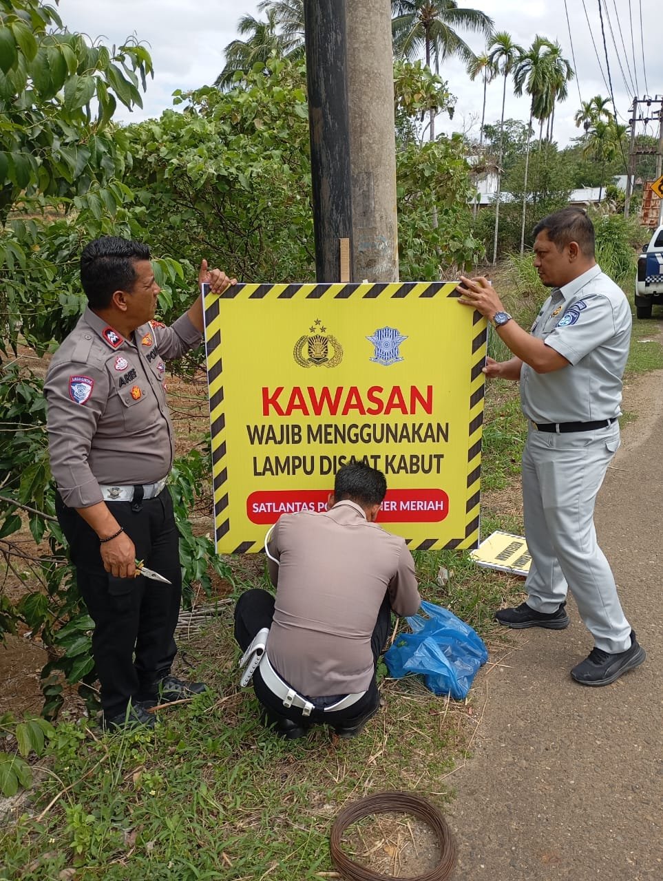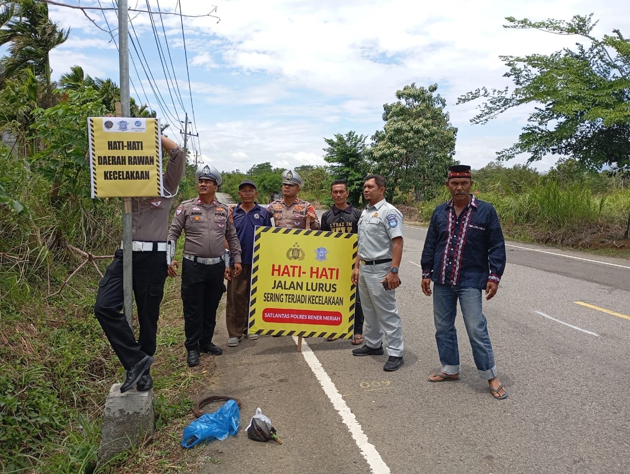 Teks. Foto:Satuan Lalu Lintas Polres Bener Meriah pasang spanduk himbauan. (GE/ist)
