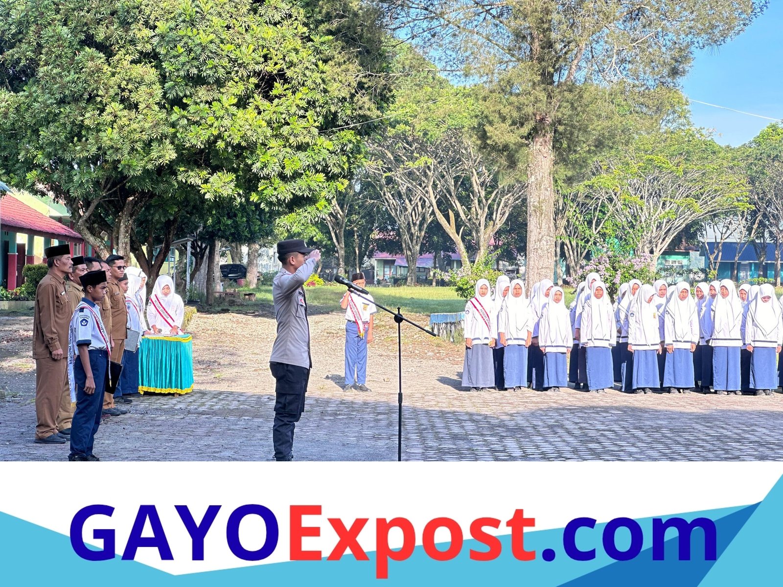 Polres Aceh Tengah Gencarkan “Saweu Sikula”, Polisi Jadi Pembina Upacara Tanamkan Disiplin Pelajar. (Ist)