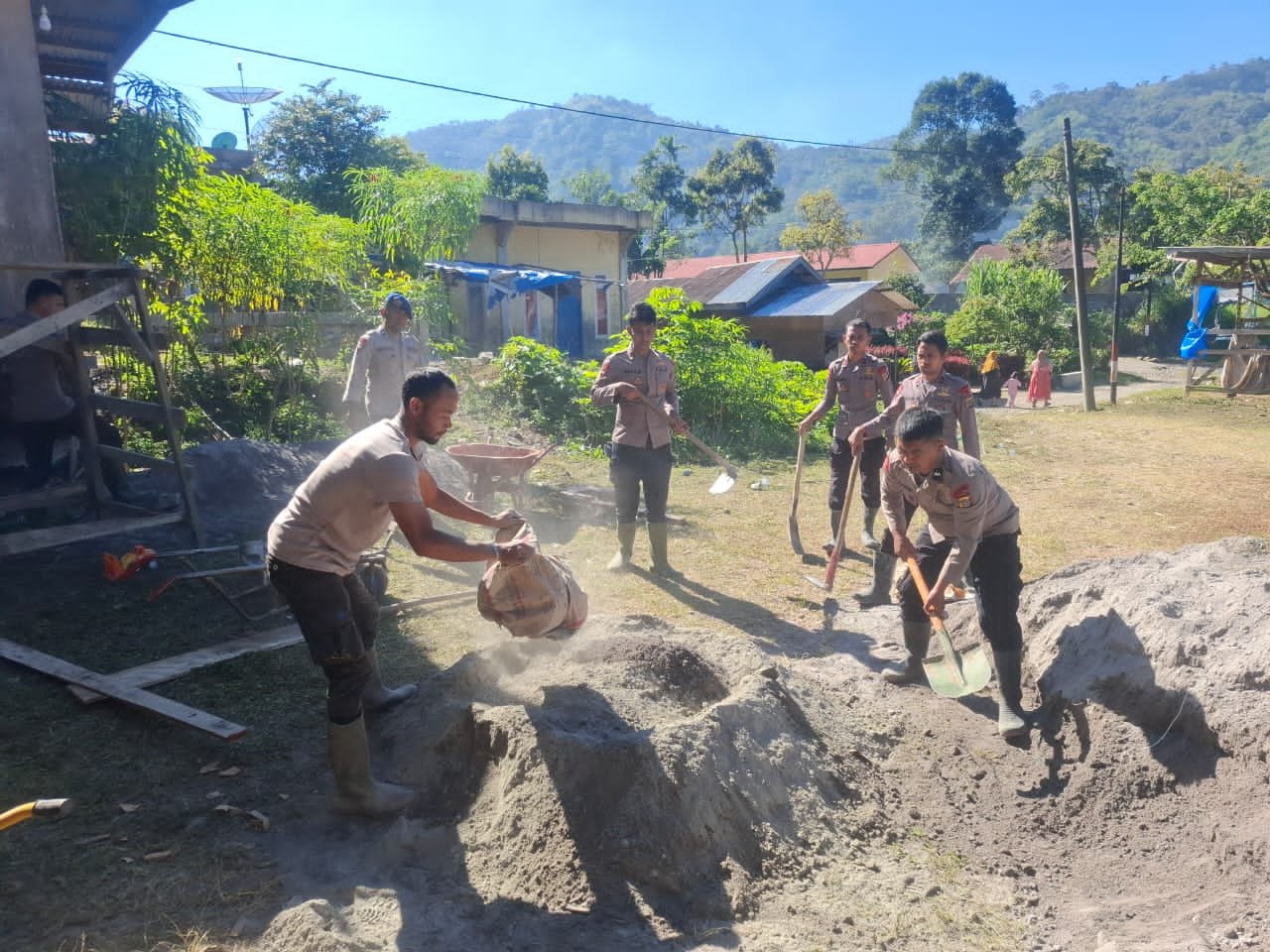 Tampak Polsek Silih Nara dan Brimob Gotong Royong Bangun Meunasah. (Ist)