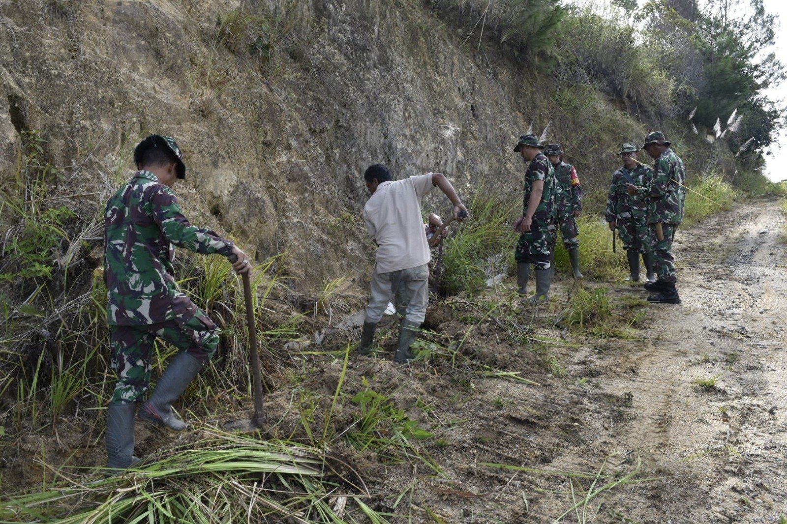 Tampak Satgas TMMD ke-126 Bersama Warga Bersihkan Jalan Sepanjang 1.750 Meter di Desa Reje Guru. (Ist)