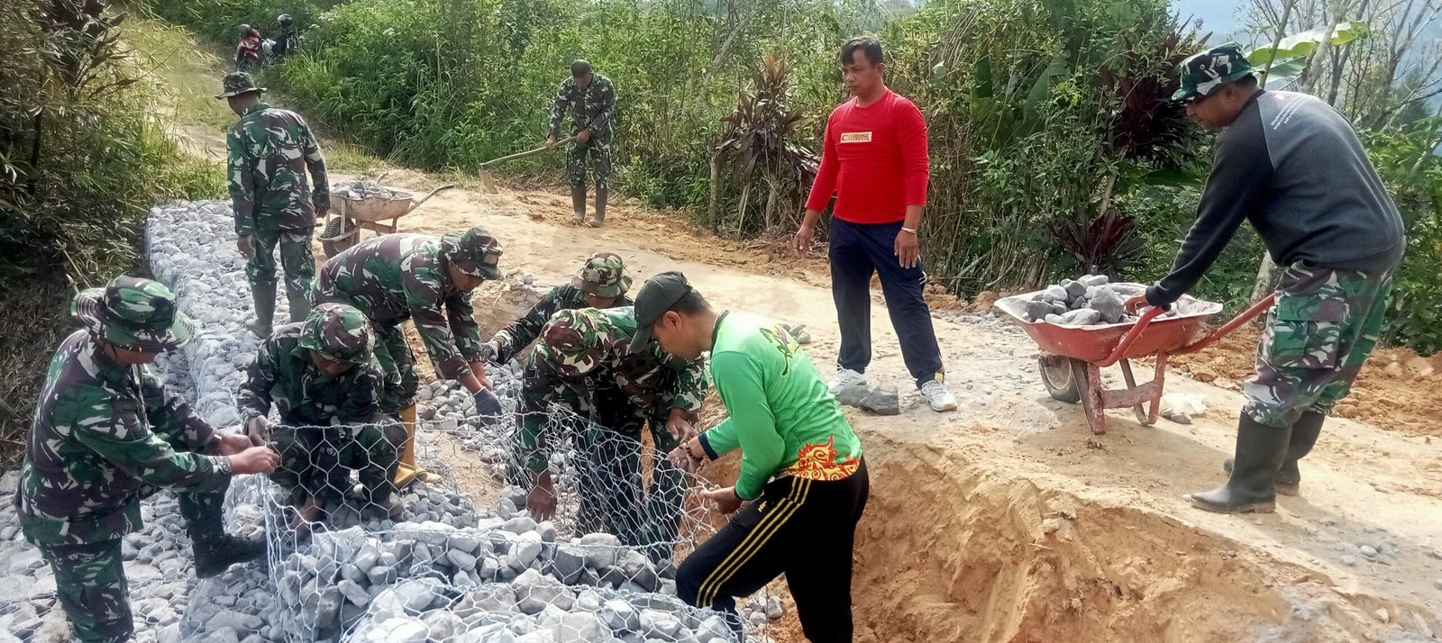 Semangat Tak Luntur di Bawah Terik Matahari, Satgas TMMD dan Warga Terus Kebut Bronjongisasi Tebing. (Ist)
