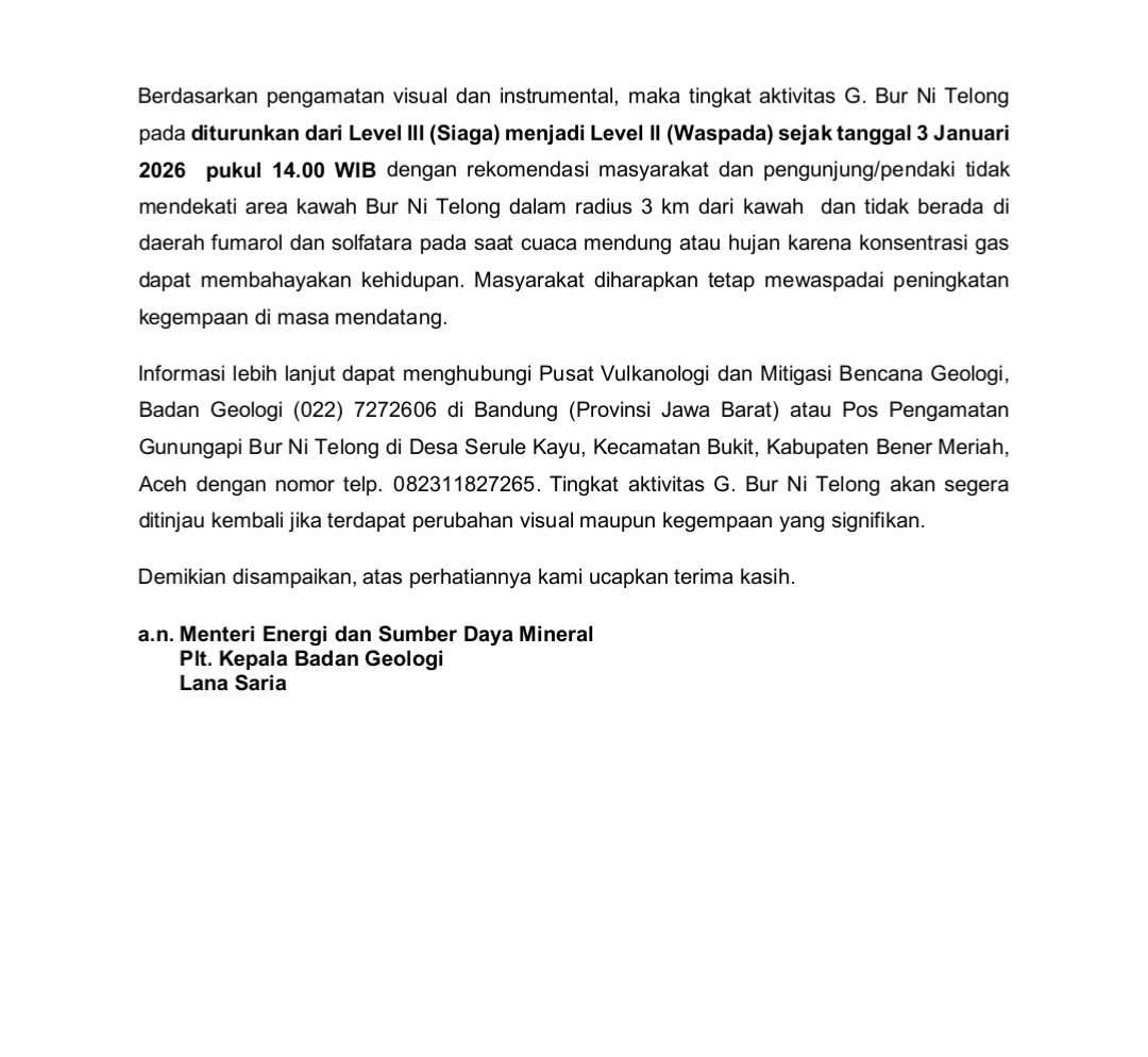 Bener Meriah (GAYOExpost.com) – Kabar menenangkan datang dari Gunung Bur Ni Telong, Kabupaten Bener Meriah, Aceh. Setelah sempat berada pada status Level III (Siaga) akibat lonjakan aktivitas kegempaan, Pusat Vulkanologi dan Mitigasi Bencana Geologi (PVMBG) resmi menurunkan status gunung api tersebut menjadi Level II (Waspada) terhitung sejak Sabtu, 3 Januari 2026 pukul 14.00 WIB.