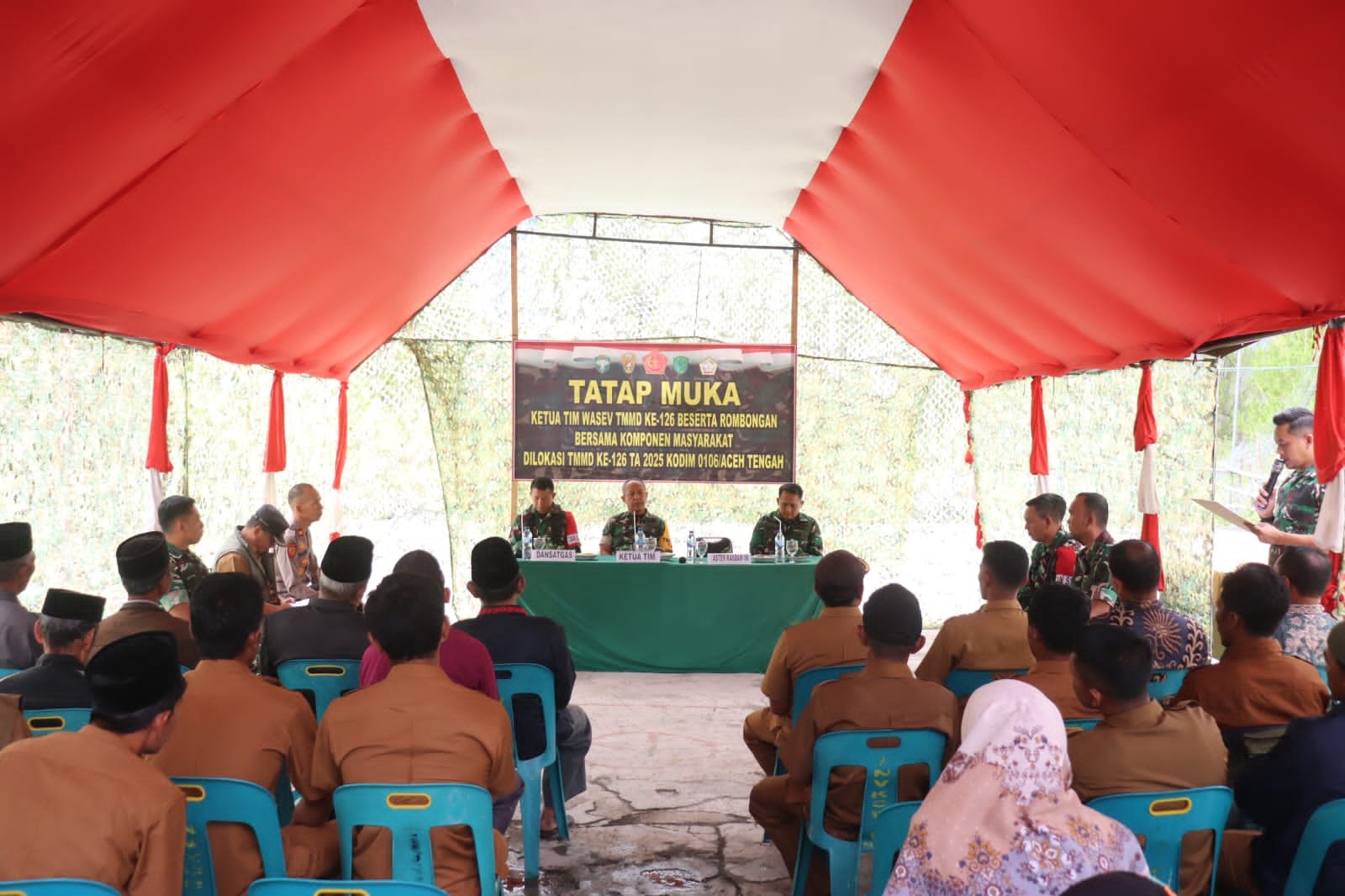 Takengon (GAYOExpost.com) – Tim Pengawas dan Evaluasi (Wasev) TMMD ke-126 Tahun 2025 yang dipimpin oleh Irut-3/Konsos Itter Itum Itjenad Kolonel Arm Ali Nabahan, S.H., didampingi Aster Kasdam IM Kolonel Inf Fransisko, S.E., S.Kom., serta Dandim 0106/Aceh Tengah Letkol Inf Raden Herman Sasmita, melaksanakan tatap muka dengan masyarakat Desa Kute Keramil, Kecamatan Linge, Kabupaten Aceh Tengah, Sabtu (18/10/2025).