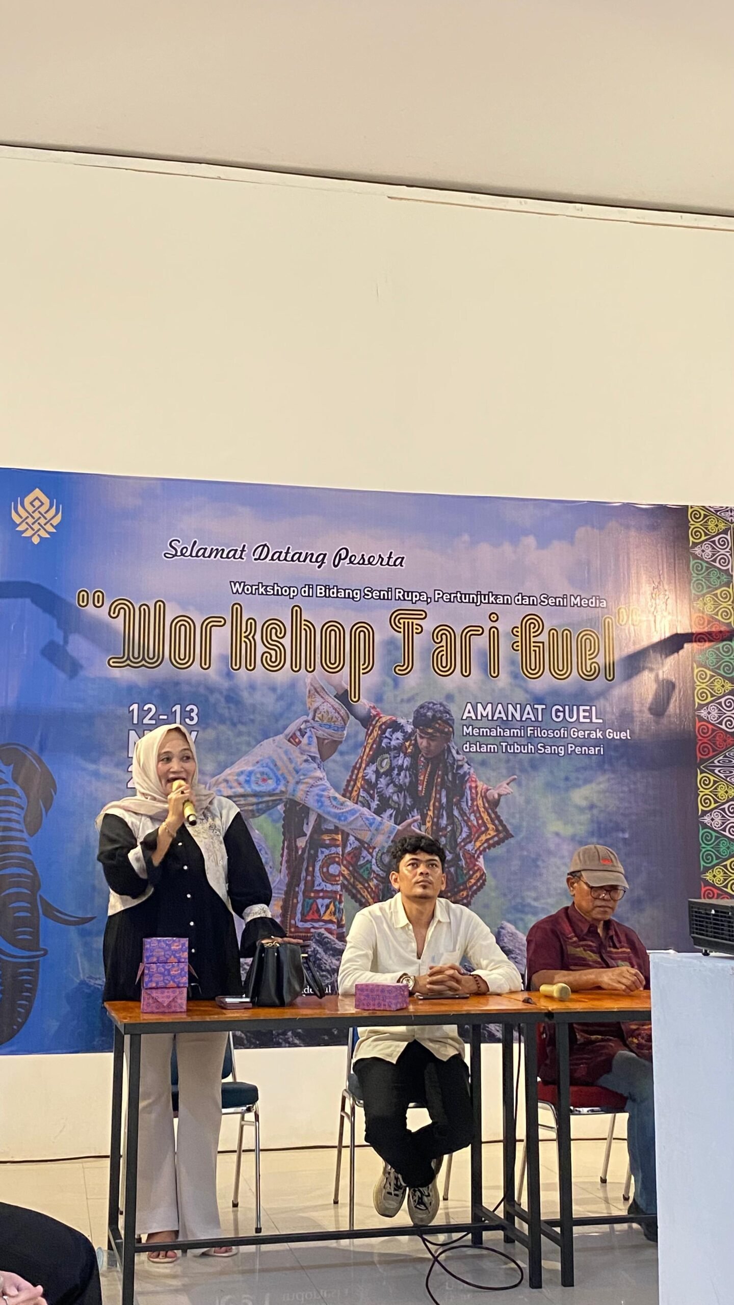 Untuk itu, Workshop seni rupa, pertunjukan, seni media Tentang tari Guel Digelar. Mengangkat tema “Amanat Tari Guel” yang bertujuan untuk Memahami Filosofi Tari Guel dalam gerak sang penari.