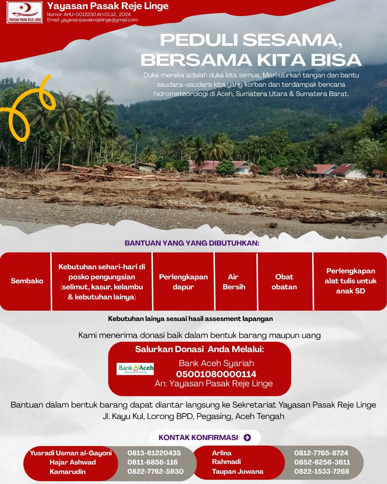 Yayasan Pasak Reje Linge Buka Donasi untuk Korban Longsor dan Banjir di Aceh, Sumut, dan Sumbar